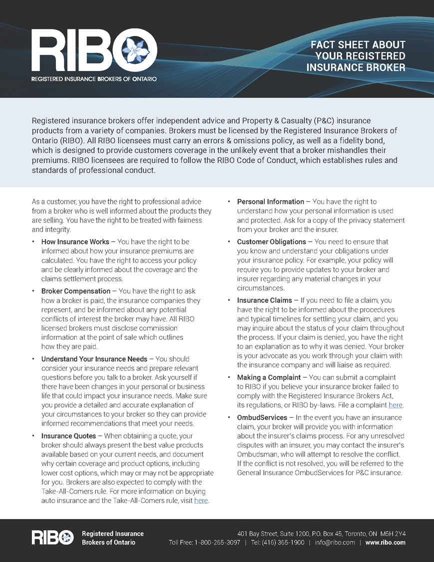 The Registered Insurance Brokers of Ontario (RIBO) is the self-regulatory body for insurance brokers in Ontario. RIBO regulates the licensing, professional competence, ethical conduct, and insurance related financial obligations of all independent general insurance brokers in the province.